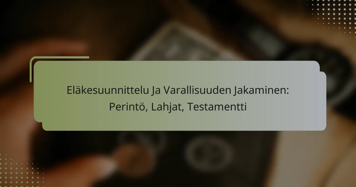 Eläkesuunnittelu ja varallisuuden jakaminen sisältävät useita tärkeitä vaiheita, jotka auttavat varmistamaan taloudellisen turvallisuuden ja perheen hyvinvoinnin. Näihin vaiheisiin kuuluvat eläkesuunnitelman laatiminen, testamentin tekeminen, varallisuuden jakaminen sekä asiantuntijoiden konsultointi. Oikeanlainen dokumentointi ja aikarajojen huomioiminen ovat myös keskeisiä tekijöitä prosessissa.